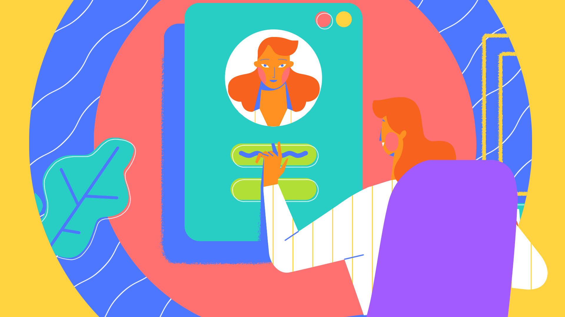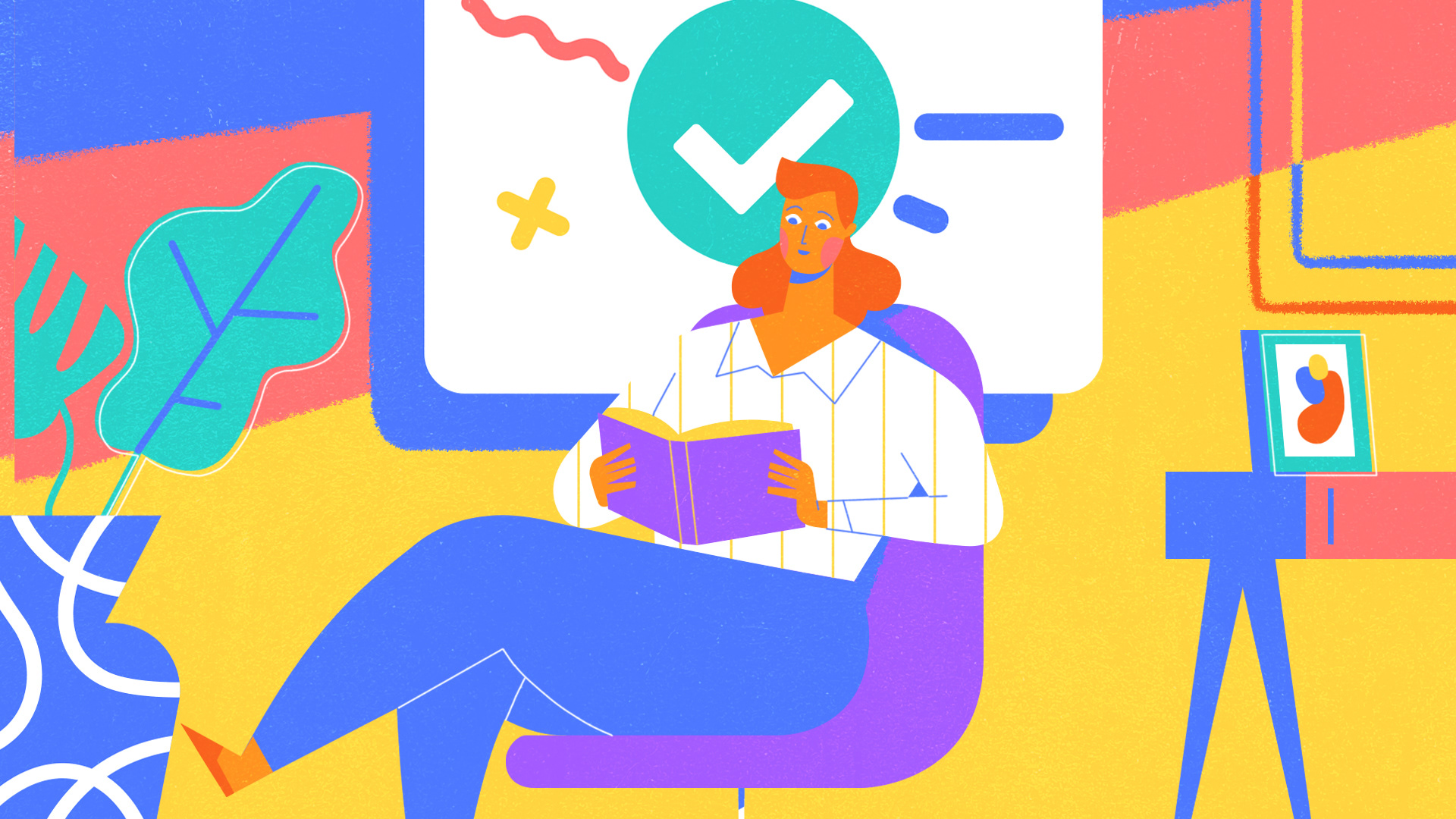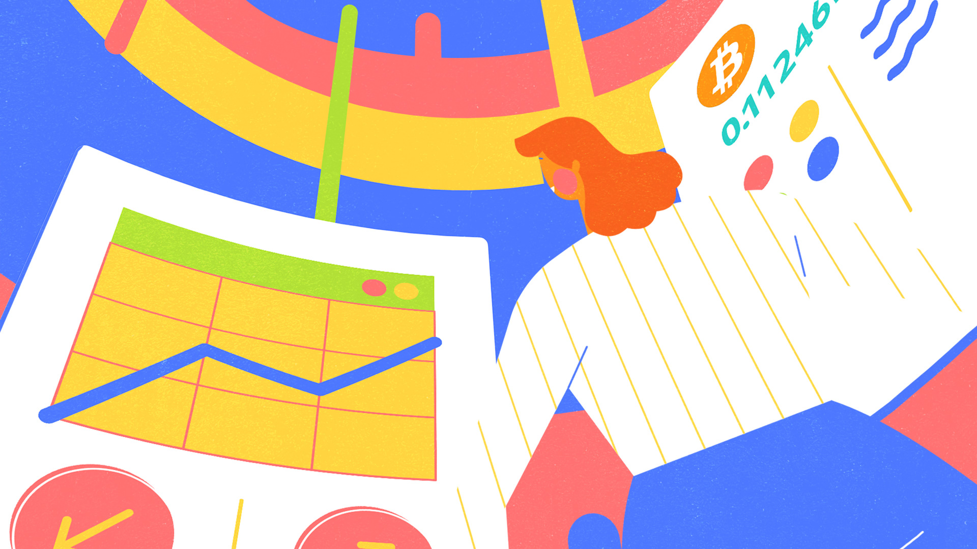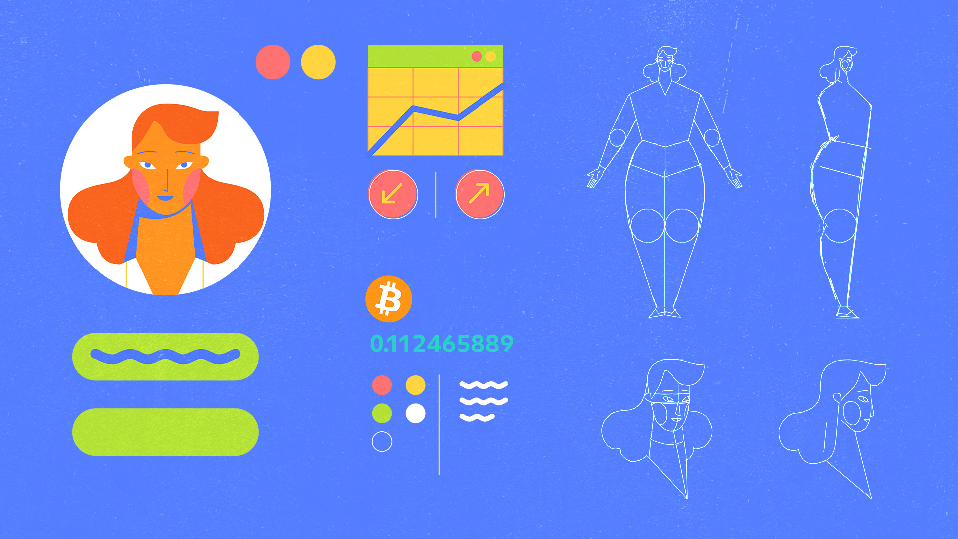 02 — Visual System Primary saturated palette — blue, yellow, red — with textured grain that gives the digital illustration a handmade warmth. A single recurring character anchors the narrative across scenes, creating continuity and familiarity. UI elements and crypto symbols are integrated into the illustrated world rather than treated as separate layers.